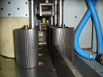 На малюнку видно, що праві подаючі ролики не переміщаються в горизонтальній площині, тому установка центральної напрямної неможлива. Однак, можливо подавати у верстат дві заготовки однакової довжини одночасно. При цьому базування двох заготовок буде здійснюватися по напрямній лінійці, яка встановлена на подавальному столі. Рекомендується також виконувати пропил зовнішніх сторін крайніх заготовок для того, щоб на одержуваних ламелях не було слідів від роликів.